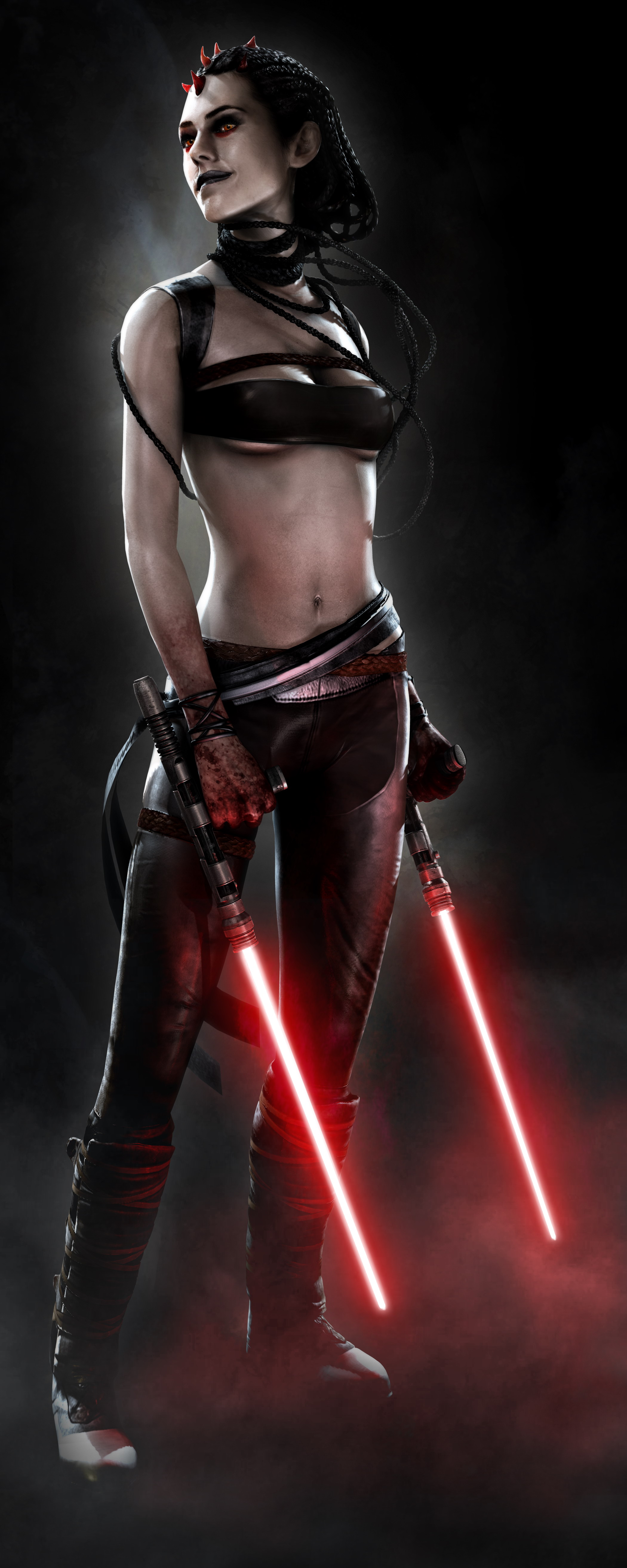 She wielded twin red lightsabers with tonfa shaped hilts. While on Felucia, she took to using a pair of guard shotos, which she wielded against Vader's apprentice.